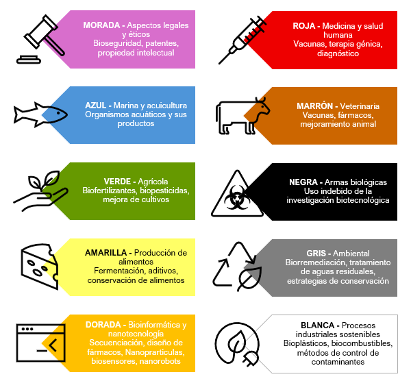 La diversidad de las aplicaciones de la biotecnología es tan grande que se ha clasificado en diferentes “colores”, cada uno asociado a un sector específico [3,4].